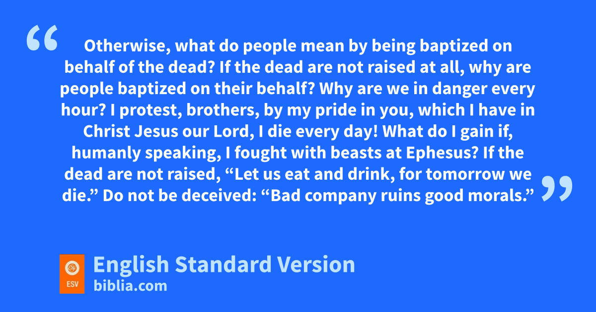 29 Otherwise, what do people mean by being baptized on behalf of the dead? If the dead are not raised at all, why are people baptized on their behalf? 30 Why are we tin danger every hour? 31 I protest, brothers, by umy pride in you, which I have in Christ Jesus our Lord, vI die every day! 32 What do I gain if, humanly speaking, wI fought with beasts at Ephesus? If the dead are not raised, x“Let us eat and drink, for tomorrow we die.” 33 yDo not be deceived: z“Bad company ruins good morals.”4 34 aWake up from your drunken stupor, as is right, and do not go on sinning. For bsome have no knowledge of God. cI say this to your shame.