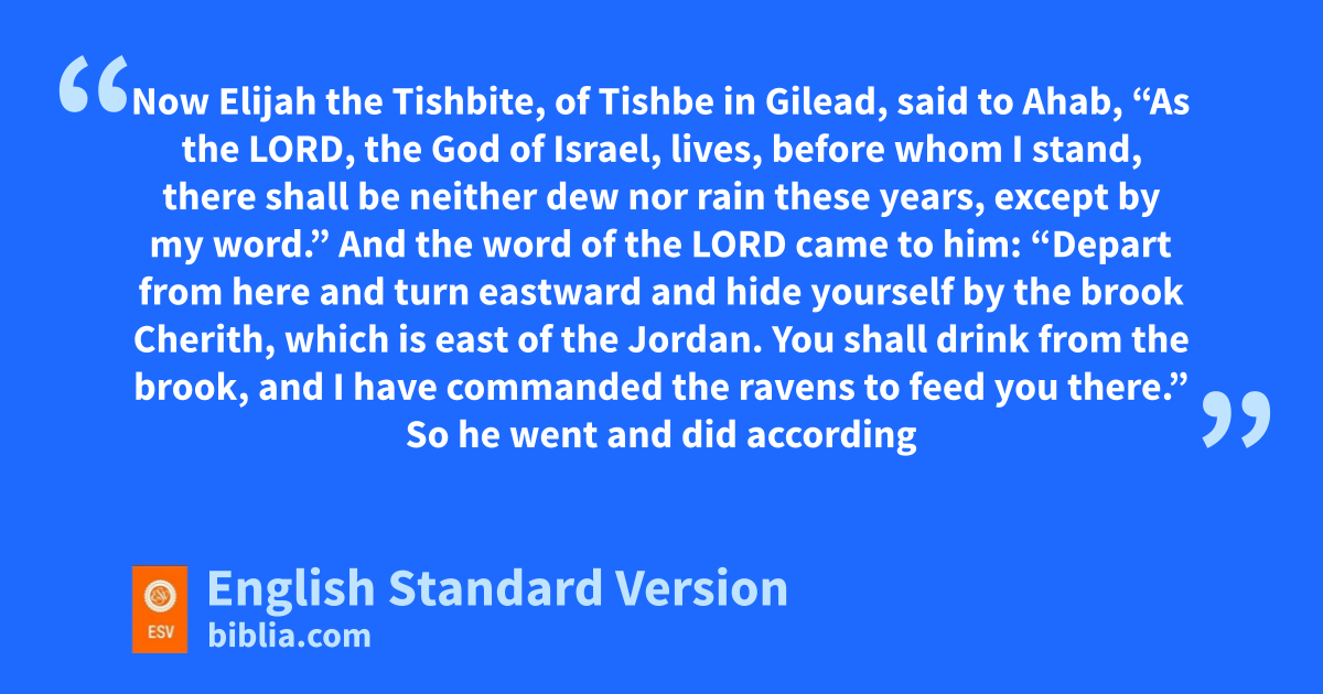 17 Now Elijah the Tishbite, of sTishbe1 in Gilead, said to Ahab, t“As the Lord, the God of Israel, lives, ubefore whom I stand, vthere shall be neither dew nor rain these years, except by my word.” 2 And the word of the Lord came to him: 3 “Depart from here and turn eastward and hide yourself by the brook Cherith, which is east of the Jordan. 4 You shall drink from the brook, and I have commanded the ravens to feed you there.” 5 So he went and did according to the word of the Lord. He went and lived by the brook Cherith that is east of the Jordan. 6 And the ravens brought him bread and meat in the morning, and bread and meat in the evening, and he drank from the brook. 7 And after a while the brook dried up, because there was no rain in the land.