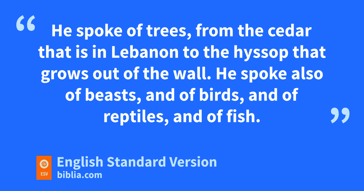 29 cAnd God gave Solomon wisdom and understanding beyond measure, and breadth of mind dlike the sand on the seashore, 30 so that Solomon’s wisdom surpassed the wisdom of all ethe people of the east fand all the wisdom of Egypt. 31 For he was cwiser than all other men, wiser than Ethan the Ezrahite, and Heman, Calcol, and Darda, the sons of Mahol, and his fame was in all the surrounding nations. 32 gHe also spoke 3,000 proverbs, hand his songs were 1,005. 33 He spoke of trees, from the cedar that is in Lebanon to the hyssop that grows out of the wall. He spoke also of beasts, and of birds, and of reptiles, and of fish. 34 And people of all nations came to hear the wisdom of Solomon, and from iall the kings of the earth, who had heard of his wisdom.