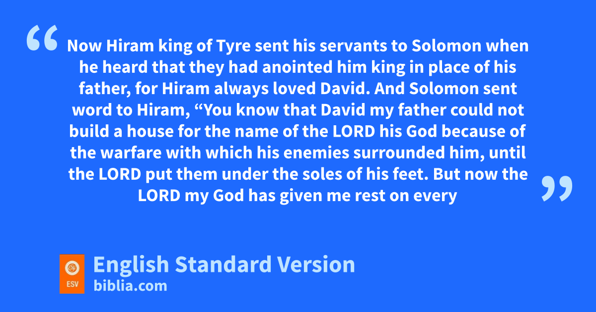 5 1 Now jHiram king of Tyre sent his servants to Solomon when he heard that they had anointed him king in place of his father, kfor Hiram always loved David. 2 And Solomon sent word to Hiram, 3 l“You know that David my father could not build a house for the name of the Lord his God mbecause of the warfare with which his enemies surrounded him, until the Lord put them under the soles of his feet. 4 nBut now the Lord my God has given me rest on every side. There is neither adversary nor misfortune. 5 And so I intend to build a house for the name of the Lord my God, oas the Lord said to David my father, ‘Your son, whom I will set on your throne in your place, shall build the house for my name.’ 6 Now therefore command that cedars of Lebanon be cut for me. And my servants will join your servants, and I will pay you for your servants such wages as you set, for you know that there is no one among us who knows how to cut timber like the Sidonians.”