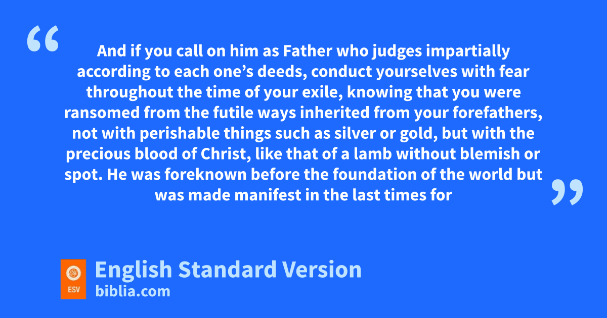 13 Therefore, gpreparing your minds for action,2 and hbeing sober-minded, set your hope fully on the grace that will be brought to you at the revelation of Jesus Christ. 14 As obedient children, ido not be conformed to the passions jof your former ignorance, 15 but kas he who called you is holy, you also be holy lin all your conduct, 16 since it is written, m“You shall be holy, for I am holy.” 17 And if you ncall on him as Father who ojudges pimpartially according to each one’s deeds, conduct yourselves qwith fear throughout the time of your exile, 18 knowing that you rwere ransomed from sthe futile ways inherited from your forefathers, not with perishable things such as silver or gold, 19 but twith the precious blood of Christ, like that of ua lamb vwithout blemish or spot. 20 He was foreknown before the foundation of the world but wwas made manifest xin the last times for the sake of you 21 ywho through him are believers in God, zwho raised him from the dead and agave him glory, so that your faith and hope are in God.