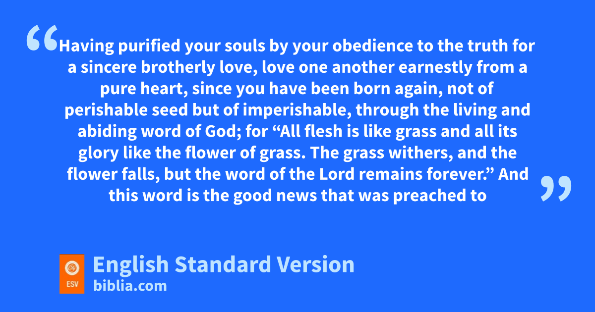 22 Having purified your souls by your obedience to the truth for ba sincere brotherly love, clove one another earnestly from a pure heart, 23 dsince you have been born again, enot of perishable seed but of imperishable, through fthe living and abiding word of God; 24 for