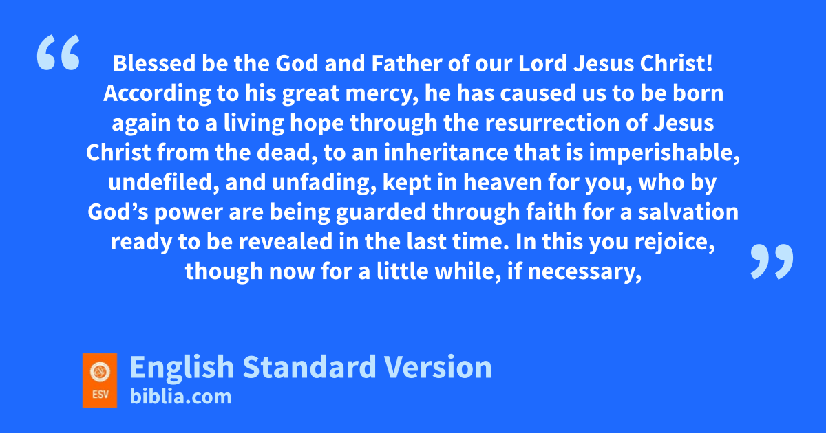 3 gBlessed be the God and Father of our Lord Jesus Christ! hAccording to his great mercy, ihe has caused us to be born again to a living hope jthrough the resurrection of Jesus Christ from the dead, 4 to kan inheritance that is imperishable, undefiled, and lunfading, mkept in heaven for you, 5 who by God’s power are being guarded nthrough faith for a salvation oready to be revealed in the last time. 6 In this you rejoice, though now for a little while, if necessary, you have been grieved by pvarious trials, 7 so that qthe tested genuineness of your faith—more precious than gold that perishes rthough it is tested by sfire—may be found to result in tpraise and glory and honor at the revelation of Jesus Christ. 8 uThough you have not seen him, you love him. vThough you do not now see him, you believe in him and rejoice with joy that is inexpressible and filled with glory, 9 obtaining wthe outcome of your faith, the salvation of your souls.
