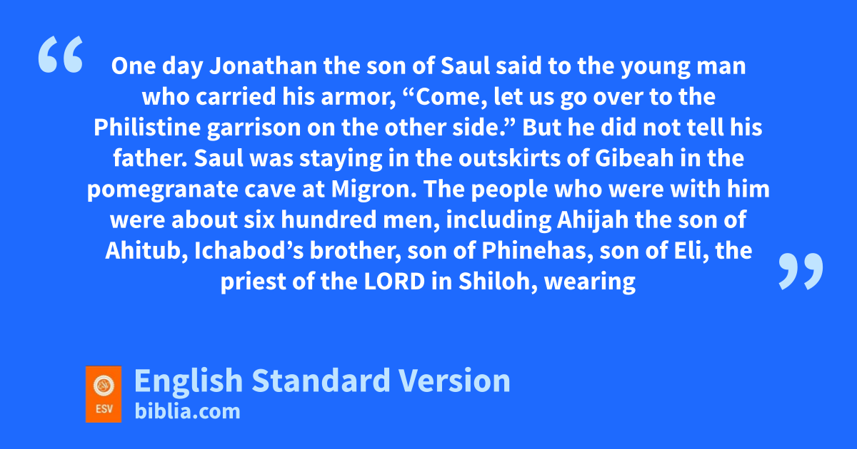 14 One day Jonathan the son of Saul said to the young man who carried his armor, “Come, let us go over to the Philistine garrison on the other side.” But he did not tell his father. 2 Saul was staying in the outskirts of Gibeah in the pomegranate cave1 at hMigron. The people who were with him were about isix hundred men, 3 including jAhijah the son of Ahitub, kIchabod’s brother, son of Phinehas, son of Eli, the priest of the Lord lin Shiloh, mwearing an ephod. And the people did not know that Jonathan had gone. 4 Within nthe passes, by which Jonathan sought to go over to the Philistine garrison, there was a rocky crag on the one side and a rocky crag on the other side. The name of the one was Bozez, and the name of the other Seneh. 5 The one crag rose on the north in front of Michmash, and the other on the south in front of oGeba.