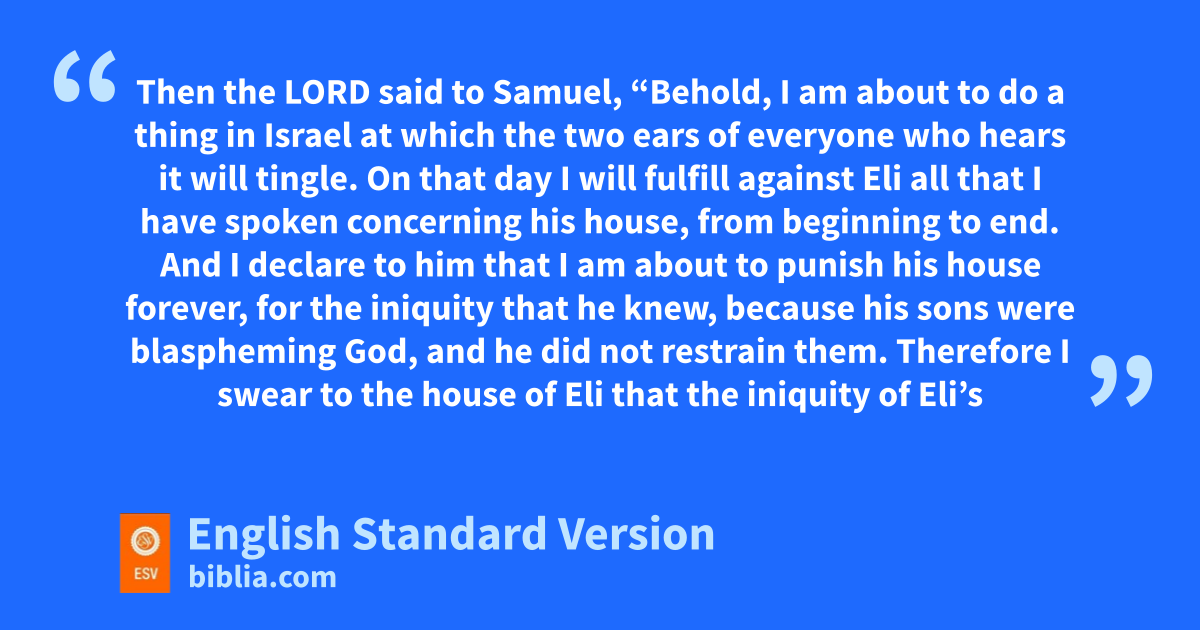 10 And the Lord came and stood, calling as at other times, “Samuel! Samuel!” And Samuel said, “Speak, for your servant hears.” 11 Then the Lord said to Samuel, “Behold, I am about to do a thing in Israel kat which the two ears of everyone who hears it will tingle. 12 On that day I will fulfill against Eli lall that I have spoken concerning his house, from beginning to end. 13 lAnd I declare to him that I am about to punish his house forever, for the iniquity that he knew, mbecause his sons were blaspheming God,1 nand he did not restrain them. 14 Therefore I swear to the house of Eli othat the iniquity of Eli’s house shall not be atoned for by sacrifice or offering forever.”