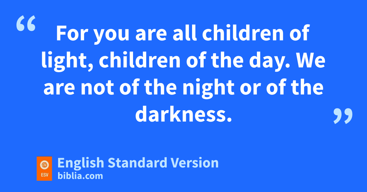 5 Now concerning wthe times and the seasons, brothers,1 xyou have no need to have anything written to you. 2 For you yourselves are fully aware that ythe day of the Lord will come like a thief in the night. 3 While people are saying, “There is peace and security,” then zsudden destruction will come upon them aas labor pains come upon a pregnant woman, and they will not escape. 4 But you bare not in darkness, brothers, for that day to surprise you like a thief. 5 For you are all cchildren2 of light, children of the day. We are not of the night or of the darkness. 6 So then dlet us not sleep, as others do, but let us ekeep awake and fbe sober. 7 For those who sleep, sleep at night, and those who get drunk, gare drunk at night. 8 But since we belong to the day, let us be sober, hhaving put on the breastplate of ifaith and love, and for a helmet the hope of salvation. 9 For God has not destined us for jwrath, but kto obtain salvation through our Lord Jesus Christ, 10 lwho died for us so that whether we are awake or asleep we might live with him. 11 Therefore encourage one another and build one another up, just as you are doing.