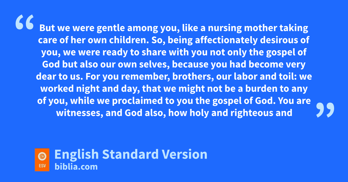 2 For you yourselves know, brothers,1 that our fcoming to you gwas not in vain. 2 But though we had already suffered and been shamefully treated hat Philippi, as you know, iwe had boldness in our God jto declare to you the gospel of God in the midst of much kconflict. 3 For lour appeal does not spring from merror or nimpurity or oany attempt to deceive, 4 but just as we have been approved by God pto be entrusted with the gospel, so we speak, not qto please man, but to please God rwho tests our hearts. 5 sFor we never came with words of flattery,2 as you know, nor with a pretext for greed—tGod is witness. 6 uNor did we seek glory from people, whether from you or from others, vthough we could have made wdemands as xapostles of Christ. 7 But we were ygentle3 among you, zlike a nursing mother taking care of her own children. 8 So, being affectionately desirous of you, we were ready to share with you not only the gospel of God abut also our own selves, because you had become very dear to us.