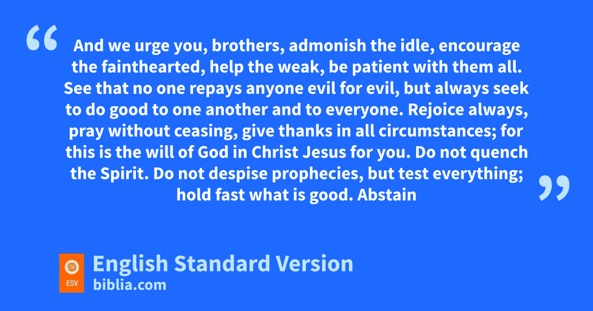 12 We ask you, brothers, mto respect those who labor among you and nare over you in the Lord and admonish you, 13 and to esteem them very highly in love because of their work. oBe at peace among yourselves. 14 And we urge you, brothers, admonish pthe idle,3 qencourage the fainthearted, rhelp the weak, sbe patient with them all. 15 See that tno one repays anyone evil for evil, but always useek to do good to one another and to everyone. 16 vRejoice always, 17 wpray without ceasing, 18 xgive thanks in all circumstances; for this is the will of God in Christ Jesus for you. 19 yDo not quench the Spirit. 20 Do not despise zprophecies, 21 but atest everything; hold fast what is good. 22 Abstain from every form of evil.