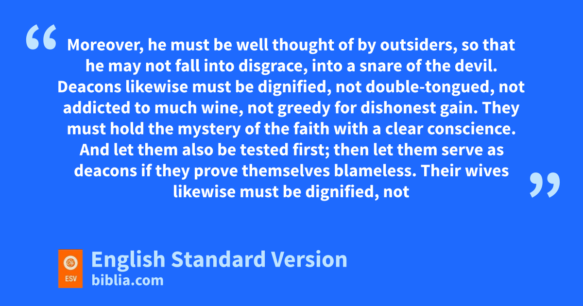 8 iDeacons likewise must be dignified, not double-tongued,3 jnot addicted to much wine, knot greedy for dishonest gain. 9 They must lhold the mystery of the faith with ma clear conscience. 10 And nlet them also be tested first; then let them serve as deacons if they prove themselves blameless. 11 oTheir wives likewise4 must be dignified, not slanderers, but sober-minded, pfaithful in all things. 12 Let deacons each be qthe husband of one wife, qmanaging their children and their own households well. 13 For rthose who serve well as deacons gain a good standing for themselves and also great confidence in the faith that is in Christ Jesus.