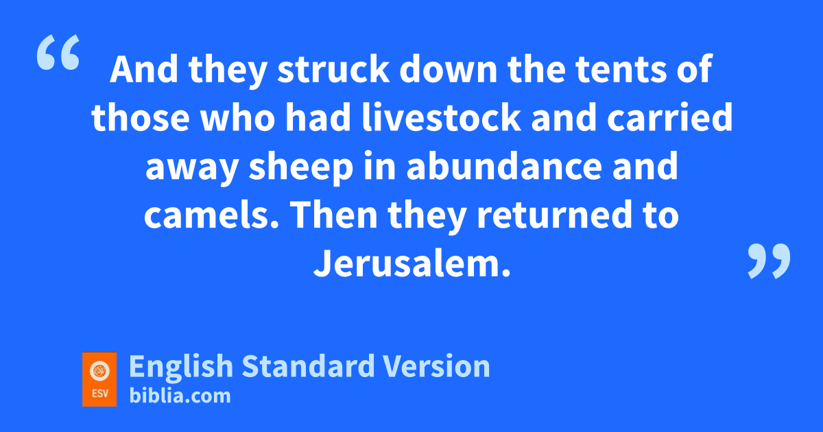 9 Zerah pthe Ethiopian came out against them with an army of a million men and 300 chariots, and came as far as qMareshah. 10 And Asa went out to meet him, and rthey drew up their lines of battle in the Valley of Zephathah at qMareshah. 11 And Asa scried to the Lord his God, “O Lord, there is none like you to help, between the mighty and the weak. Help us, O Lord our God, tfor we rely on you, uand in your name we have come against this multitude. O Lord, you are our God; let not man prevail against you.” 12 vSo the Lord defeated the Ethiopians before Asa and before Judah, and the Ethiopians fled. 13 Asa and the people who were with him pursued them as far as wGerar, and the Ethiopians fell until none remained alive, for they were broken before the Lord and his army. The men of Judah3 carried away very much spoil. 14 And they attacked all the cities around wGerar, xfor the fear of the Lord was upon them. They plundered all the cities, for there was much plunder in them. 15 And they struck down the tents of those who had livestock and carried away sheep in abundance and camels. Then they returned to Jerusalem.