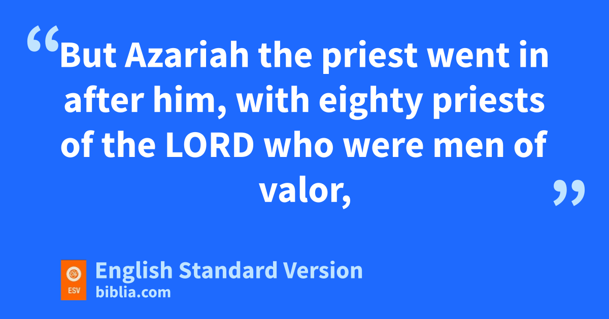 16 But when rhe was strong, she grew proud, to his destruction. For he was unfaithful to the Lord his God and entered the temple of the Lord to burn incense on the altar of incense. 17 But tAzariah the priest went in after him, with eighty priests of the Lord who were men of valor, 18 and they withstood King Uzziah and said to him, u“It is not for you, Uzziah, to burn incense to the Lord, vbut for the priests, the sons of Aaron, who are consecrated to burn incense. Go out of the sanctuary, for you have done wrong, and it will bring you no honor from the Lord God.” 19 Then Uzziah was angry. Now he had a censer in his hand to burn incense, and when he became angry with the priests, wleprosy1 broke out on his forehead in the presence of the priests in the house of the Lord, by the altar of incense. 20 And Azariah the chief priest and all the priests looked at him, and behold, he was leprous in his forehead! And they rushed him out quickly, and he himself hurried to go out, because the Lord had struck him. 21 xAnd King Uzziah was a leper to the day of his death, and being a leper lived yin a separate house, for he was excluded from the house of the Lord. And Jotham his son was over the king’s household, governing the people of the land.