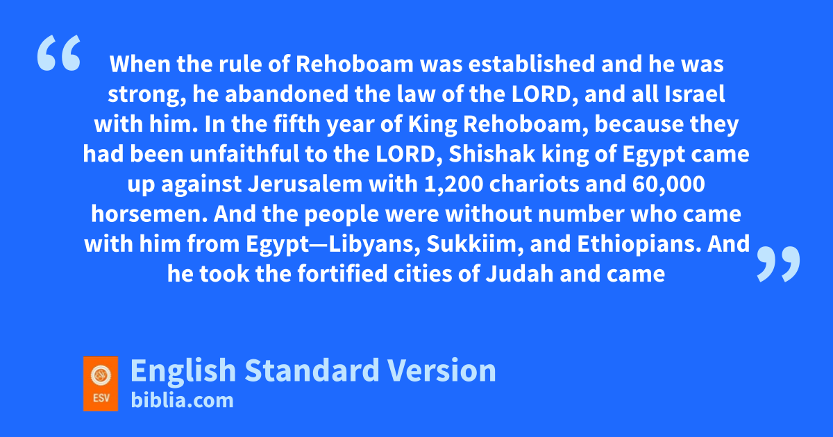 12 zWhen the rule of Rehoboam was established aand he was strong, bhe abandoned the law of the Lord, and all Israel with him. 2 cIn the fifth year of King Rehoboam, because they had been unfaithful to the Lord, dShishak king of Egypt came up against Jerusalem 3 with 1,200 chariots and 60,000 horsemen. And the people were without number who came with him from Egypt—eLibyans, Sukkiim, and Ethiopians. 4 And he took fthe fortified cities of Judah and came as far as Jerusalem. 5 Then gShemaiah the prophet came to Rehoboam and to the princes of Judah, who had gathered at Jerusalem because of Shishak, and said to them, “Thus says the Lord, h‘You abandoned me, so I have abandoned you to the hand of Shishak.’ ” 6 Then the princes of iIsrael and the king humbled themselves and said, j“The Lord is righteous.” 7 When the Lord saw that they humbled themselves, the word of the Lord came to Shemaiah: k“They have humbled themselves. I will not destroy them, but I will grant them some deliverance, land my wrath shall not be poured out on Jerusalem by the hand of Shishak. 8 Nevertheless, they shall be servants to him, mthat they may know my service and the service of the kingdoms of the countries.”