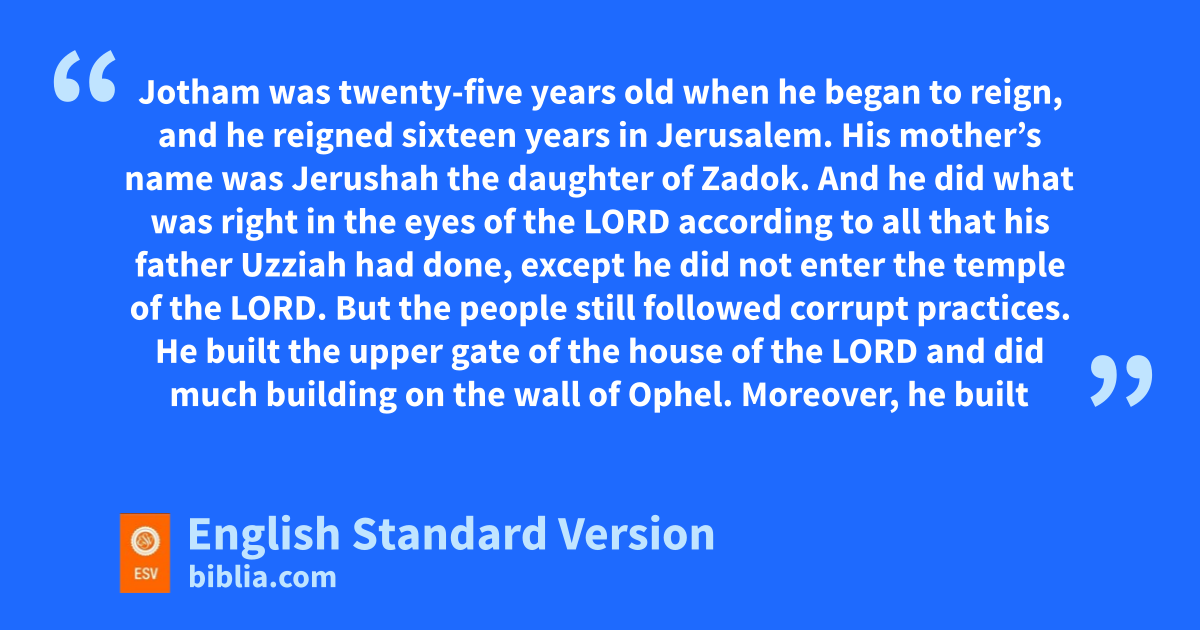 27 aJotham was twenty-five years old when he began to reign, and he reigned sixteen years in Jerusalem. His mother’s name was Jerushah the daughter of Zadok. 2 And he did what was right in the eyes of the Lord according to all that his father Uzziah had done, bexcept he did not enter the temple of the Lord. But the people still followed corrupt practices. 3 He built the upper gate of the house of the Lord and did much building on the wall of cOphel. 4 Moreover, he built cities in the hill country of Judah, and forts and towers on the wooded hills. 5 He fought with the king of the Ammonites and prevailed against them. And the Ammonites gave him that year 100 talents1 of silver, and 10,000 cors2 of wheat and 10,000 of barley. The Ammonites paid him the same amount in the second and the third years. 6 So Jotham became mighty, because he ordered his ways before the Lord his God. 7 dNow the rest of the acts of Jotham, and all his wars and his ways, behold, they are written in the Book of the Kings of Israel and Judah. 8 He was etwenty-five years old when he began to reign, and he reigned sixteen years in Jerusalem. 9 And Jotham slept with his fathers, and they buried him in the city of David, and Ahaz his son reigned in his place.