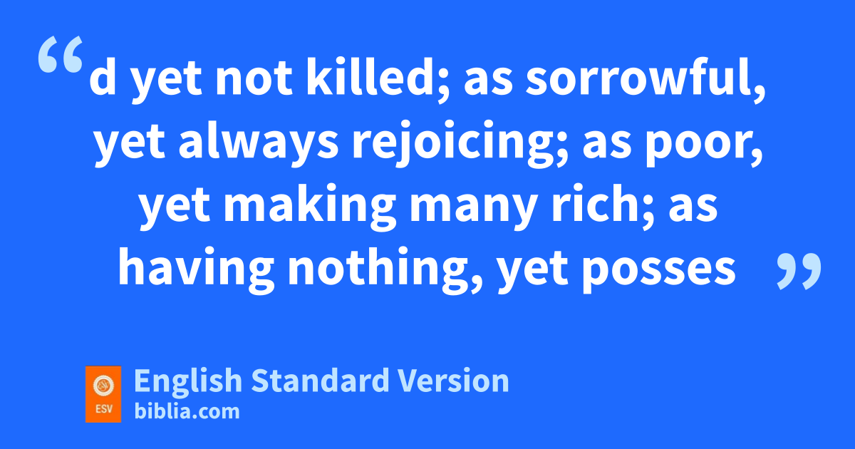 Behold, xnow is the yfavorable time; behold, now is the day of salvation. 3 We zput no obstacle in anyone’s way, so that no fault may be found with our ministry, 4 but aas servants of God we commend ourselves in every way: bby great endurance, cin afflictions, dhardships, calamities, 5 ebeatings, imprisonments, friots, labors, sleepless nights, hunger; 6 gby purity, hknowledge, patience, kindness, ithe Holy Spirit, jgenuine love; 7 by ktruthful speech, and lthe power of God; with mthe weapons of righteousness for the right hand and for the left; 8 through honor and dishonor, nthrough slander and praise. We are treated as impostors, and yet are true; 9 as unknown, and oyet well known; pas dying, and behold, we live; qas punished, and yet not killed; 10 ras sorrowful, yet always rejoicing; sas poor, yet making many rich; tas having nothing, uyet possessing everything.
