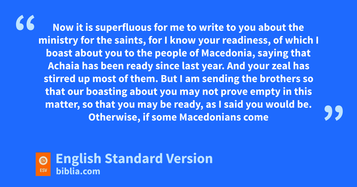 9 Now lit is superfluous for me to write to you about mthe ministry for the saints, 2 for I know your readiness, nof which I boast about you to the people of Macedonia, saying that Achaia has been ready osince last year. And your zeal has stirred up most of them. 3 But pI am sending1 the brothers so that our boasting about you may not prove empty in this matter, so that you may be ready, qas I said you would be. 4 Otherwise, if some Macedonians rcome with me and find that you are not ready, we would be humiliated—to say nothing of you—for being so confident. 5 So I thought it necessary to urge the brothers to go on ahead to you and arrange in advance for the sgift2 you have promised, so that it may be ready tas a willing gift, unot as an exaction.3