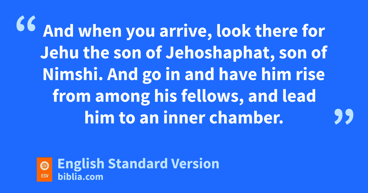 9 Then Elisha the prophet called one of cthe sons of the prophets and said to him, d“Tie up your garments, and take this eflask of oil in your hand, and go to fRamoth-gilead. 2 And when you arrive, look there for Jehu gthe son of Jehoshaphat, son of Nimshi. And go in and have him rise from among hhis fellows, and lead him to an inner chamber. 3 Then take the flask of oil and pour it on his head and say, ‘Thus says the Lord, iI anoint you king over Israel.’ Then open the door and flee; do not linger.”