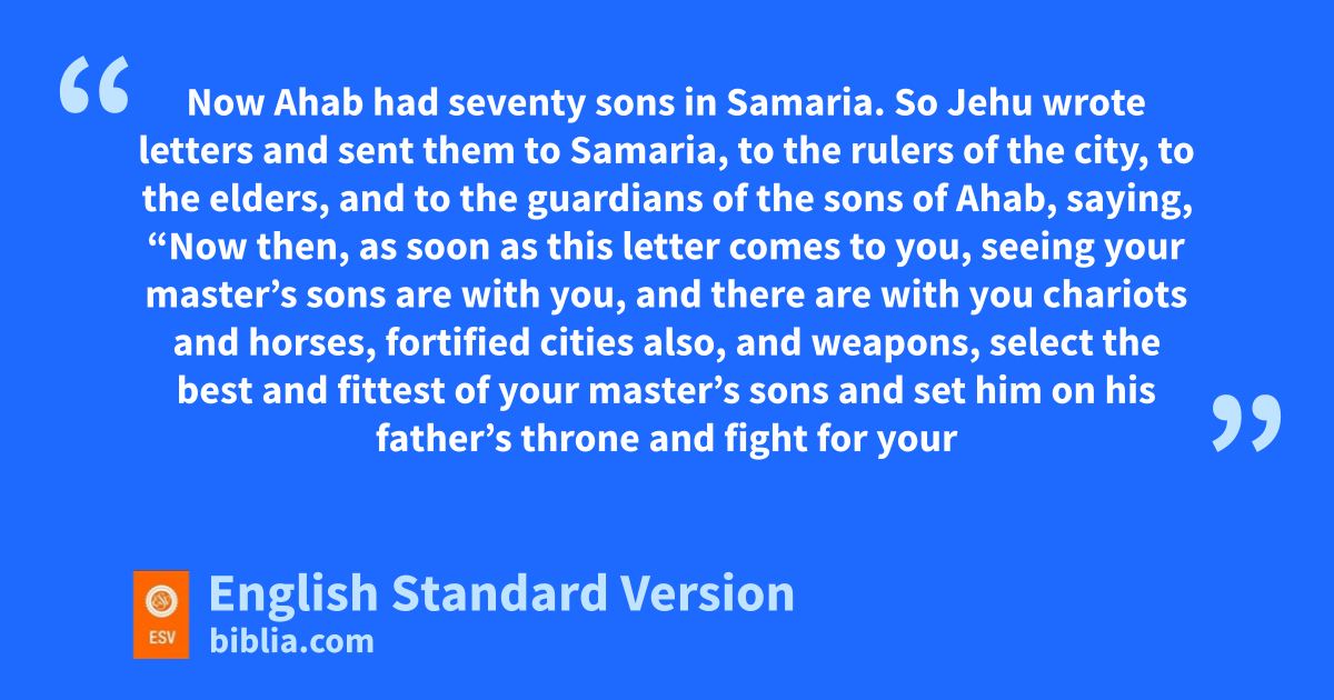 10 Now Ahab had seventy sons in pSamaria. So Jehu wrote letters and sent them to Samaria, to the rulers of the city,1 to the elders, and to qthe guardians of the sons2 of Ahab, saying, 2 “Now then, as soon as this letter comes to you, seeing your master’s sons are with you, and there are with you chariots and horses, fortified cities also, and weapons, 3 select the best and fittest of your master’s sons and set him on his father’s throne and fight for your master’s house.” 4 But they were exceedingly afraid and said, “Behold, the two kings could not stand before him. How then can we stand?” 5 So he who was over the palace, and he who was over the city, together with the elders and the guardians, sent to Jehu, saying, r“We are your servants, and we will do all that you tell us. We will not make anyone king. Do whatever is good in your eyes.” 6 Then he wrote to them a second letter, saying, “If you are on my side, and if you are ready to obey me, take the heads of your master’s sons and come to me at Jezreel tomorrow at this time.” Now the king’s sons, seventy persons, were with the great men of the city, qwho were bringing them up. 7 And as soon as the letter came to them, they took the king’s sons sand slaughtered them, seventy persons, and put their heads in baskets and sent them to him at Jezreel. 8 When the messenger came and told him, “They have brought the heads of the king’s sons,” he said, “Lay them in two heaps at the entrance of the gate until the morning.” 9 Then in the morning, when he went out, he stood and said to all the people, “You are innocent. tIt was I who conspired against my master and killed him, but who struck down all these? 10 Know then that there shall ufall to the earth nothing of the word of the Lord, which the Lord spoke concerning the house of Ahab, for the Lord has done vwhat he said by his servant Elijah.” 11 So Jehu struck down all who remained of the house of Ahab in Jezreel, all his great men and his close friends and his priests, until he left him none remaining.
