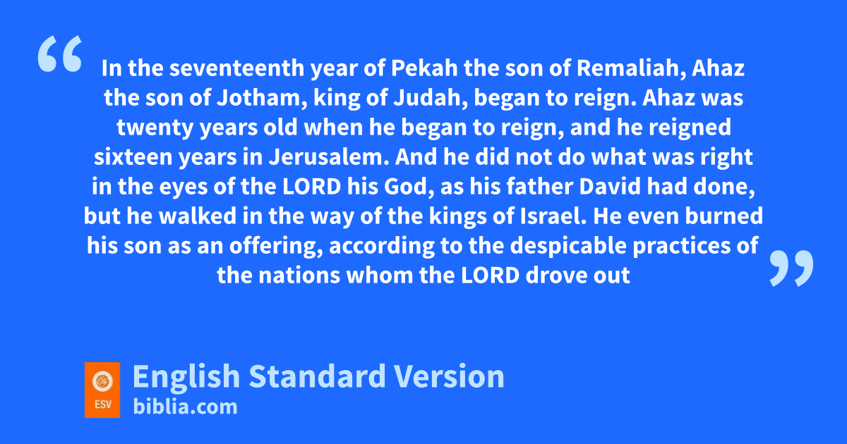16 In the seventeenth year of Pekah the son of Remaliah, Ahaz the son of Jotham, king of Judah, began to reign. 2 Ahaz was ytwenty years old when he began to reign, and he reigned sixteen years in Jerusalem. And he did not do what was right in the eyes of the Lord his God, as his father David had done, 3 but he walked in the way of the kings of Israel. zHe even burned his son as an offering,1 aaccording to the despicable practices of the nations whom the Lord drove out before the people of Israel. 4 bAnd he sacrificed and made offerings con the high places and on the hills and under every green tree.