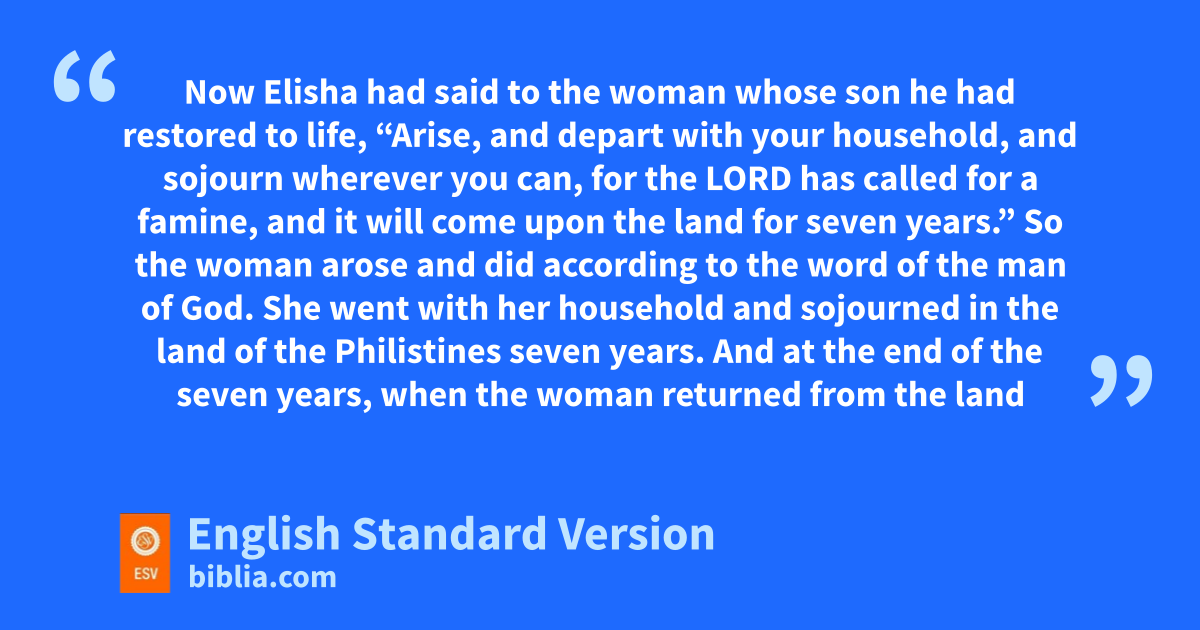 8 Now Elisha had said to the woman qwhose son he had restored to life, “Arise, and depart with your household, and sojourn wherever you can, for the Lord rhas called for a famine, and it will come upon the land for sseven years.” 2 So the woman arose and did according to the word of the man of God. She went with her household and sojourned in the land of the Philistines seven years. 3 And at the end of the seven years, when the woman returned from the land of the Philistines, she went to appeal to the king for her house and her land. 4 Now the king was talking with tGehazi the servant of the man of God, saying, “Tell me all the great things that Elisha has done.” 5 And while he was telling the king how qElisha had restored the dead to life, behold, the woman whose son he had restored to life appealed to the king for her house and her land. And Gehazi said, “My lord, O king, here is the woman, and here is her son whom Elisha restored to life.” 6 And when the king asked the woman, she told him. So the king appointed an official for her, saying, “Restore all that was hers, together with all the produce of the fields from the day that she left the land until now.”