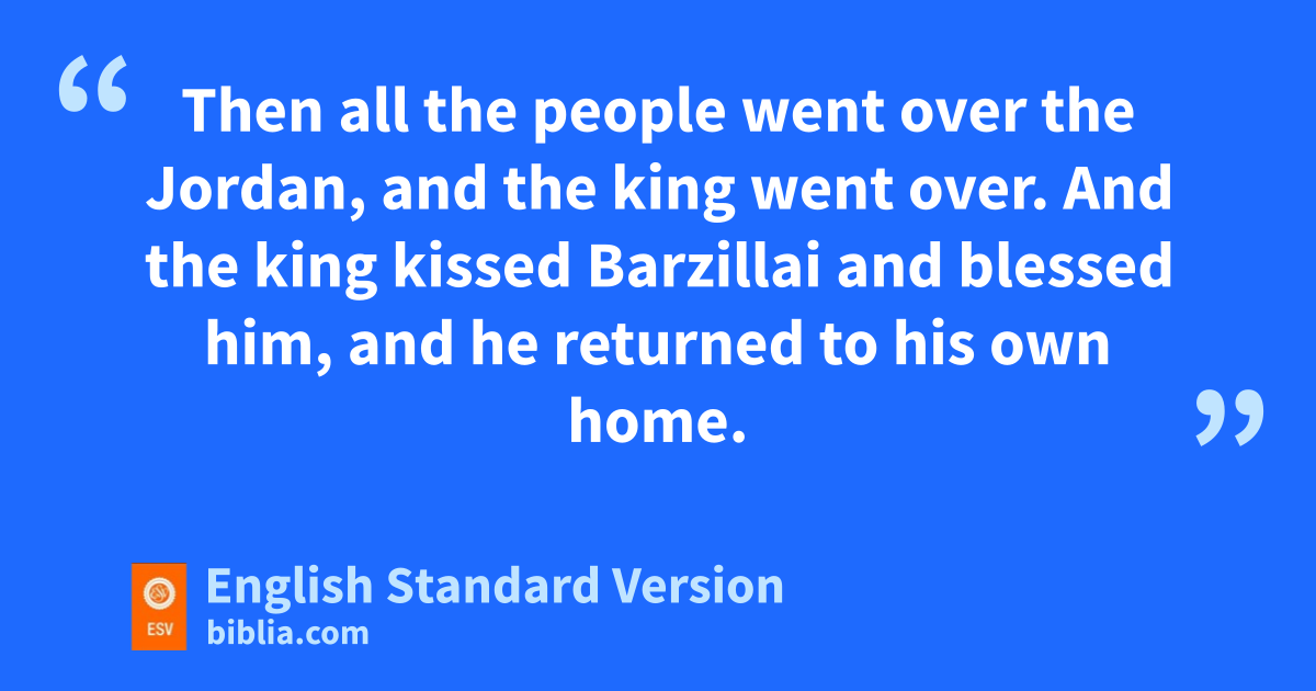 31 Now sBarzillai the Gileadite had come down from Rogelim, and he went on with the king to the Jordan, to escort him over the Jordan. 32 Barzillai was a very aged man, eighty years old. tHe had provided the king with food while he stayed at Mahanaim, for he was a very wealthy man. 33 And the king said to Barzillai, “Come over with me, and I will provide for you with me in Jerusalem.” 34 But Barzillai said to the king, u“How many years have I still to live, that I should go up with the king to Jerusalem? 35 I am this day veighty years old. Can I discern what is pleasant and what is not? Can your servant taste what he eats or what he drinks? Can I still listen to the voice of singing men and singing women? Why then should your servant be wan added burden to my lord the king? 36 Your servant will go a little way over the Jordan with the king. Why should the king repay me with such a reward? 37 Please let your servant return, that I may die in my own city near the grave of my father and my mother. But here is your servant xChimham. Let him go over with my lord the king, and do for him whatever seems good to you.” 38 And the king answered, “Chimham shall go over with me, and I will do for him whatever seems good to you, and all that you desire of me I will do for you.” 39 Then all the people went over the Jordan, and the king went over. And ythe king kissed Barzillai and blessed him, and he returned to his own home. 40 The king went on to Gilgal, and Chimham went on with him. All the people of Judah, and also half the people of Israel, brought the king on his way.