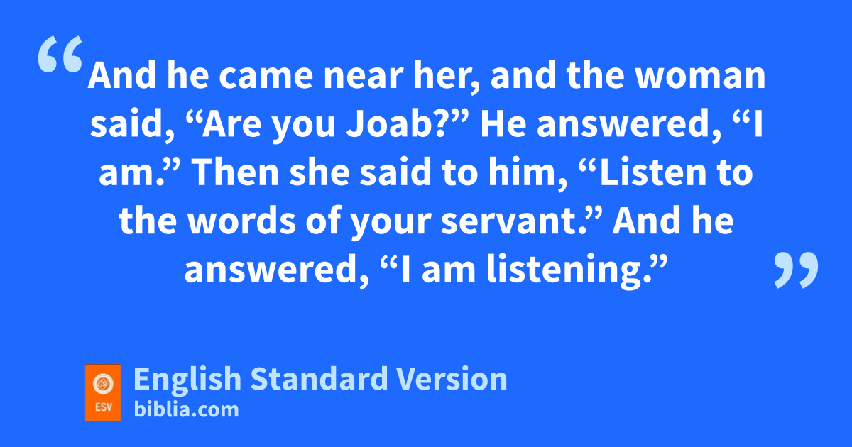 14 And Sheba passed through all the tribes of Israel to nAbel of nBeth-maacah,2 and all othe Bichrites3 assembled and followed him in. 15 And all the men who were with Joab came and besieged him in nAbel of Beth-maacah. pThey cast up a mound against the city, and it stood against the rampart, and they were battering the wall to throw it down. 16 Then a wise woman called from the city, “Listen! Listen! Tell Joab, ‘Come here, that I may speak to you.’ ” 17 And he came near her, and the woman said, “Are you Joab?” He answered, “I am.” Then she said to him, “Listen to the words of your servant.” And he answered, “I am listening.” 18 Then she said, “They used to say in former times, ‘Let them but ask counsel at nAbel,’ and so they settled a matter. 19 I am one of those who are peaceable and faithful in Israel. You seek to destroy a city that is a mother in Israel. Why will you qswallow up rthe heritage of the Lord?” 20 Joab answered, “Far be it from me, far be it, that I should qswallow up or destroy! 21 That is not true. But a man of sthe hill country of Ephraim, called Sheba the son of Bichri, has lifted up his hand against King David. Give up him alone, and I will withdraw from the city.” And the woman said to Joab, “Behold, his head shall be thrown to you over the wall.” 22 Then the woman went to all the people tin her wisdom. And they cut off the head of Sheba the son of Bichri and threw it out to Joab. So he blew the trumpet, and they dispersed from the city, uevery man to his home. And Joab returned to Jerusalem to the king.