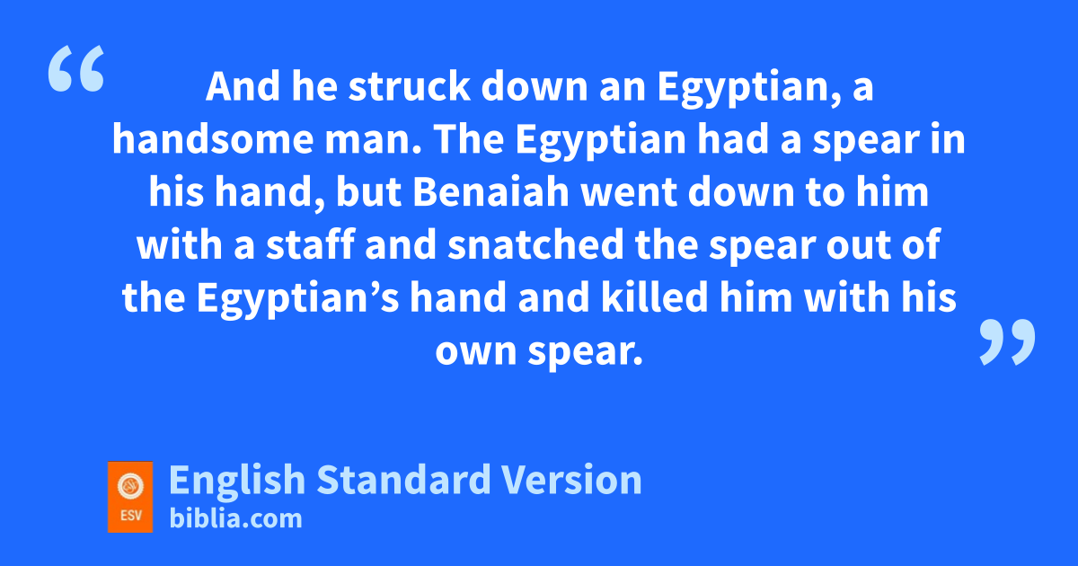 20 And cBenaiah the son of Jehoiada was a valiant man11 of dKabzeel, a doer of great deeds. He struck down two ariels12 of Moab. He also went down and struck down a lion in a pit on a day when snow had fallen. 21 And he struck down an Egyptian, a handsome man. The Egyptian had a spear in his hand, but Benaiah went down to him with a staff and snatched the spear out of the Egyptian’s hand and killed him with his own spear. 22 These things did Benaiah the son of Jehoiada, and won a name beside the three mighty men. 23 He was renowned among the thirty, but he did not attain to the three. And David set him over his bodyguard.