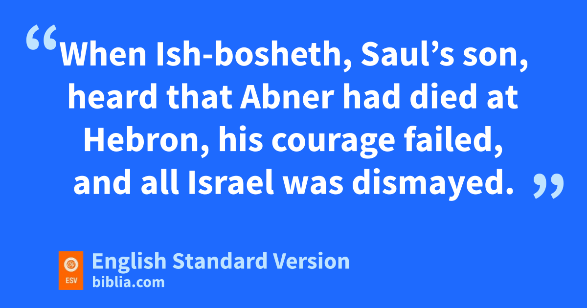 4 When Ish-bosheth, Saul’s son, heard that Abner had died at Hebron, fhis courage failed, and all Israel was dismayed. 2 Now Saul’s son had two men who were captains of raiding bands; the name of the one was Baanah, and the name of the other Rechab, sons of Rimmon a man of Benjamin from Beeroth (gfor Beeroth also is counted part of Benjamin; 3 hthe Beerothites fled ito Gittaim and have been sojourners there to this day).