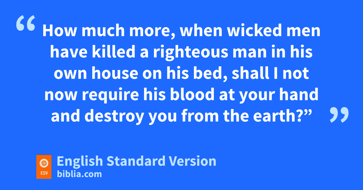 5 Now the sons of Rimmon the Beerothite, Rechab and Baanah, set out, and about the heat of the day they came to the house of Ish-bosheth as he was taking his noonday rest. 6 And they came into the midst of the house as if to get wheat, and they stabbed him lin the stomach. Then Rechab and Baanah his brother escaped.1 7 When they came into the house, as he lay on his bed in his bedroom, they struck him and put him to death and beheaded him. They took his head and went by the way of mthe Arabah all night, 8 and brought the head of Ish-bosheth to David at Hebron. And they said to the king, “Here is the head of Ish-bosheth, the son of Saul, your enemy, nwho sought your life. The Lord has avenged my lord the king this day on Saul and on his offspring.” 9 But David answered Rechab and Baanah his brother, the sons of Rimmon the Beerothite, o“As the Lord lives, pwho has redeemed my life out of every adversity, 10 qwhen one told me, ‘Behold, Saul is dead,’ and thought he was bringing good news, rI seized him and killed him at Ziklag, which was the reward I gave him for his news. 11 How much more, when wicked men have killed a righteous man in his own house on his bed, shall I not now srequire his blood at your hand and destroy you from the earth?” 12 And David commanded his young men, and they killed them and cut off their hands and feet and hanged them beside the pool at Hebron. But they took the head of Ish-bosheth and buried it tin the tomb of Abner at Hebron.
