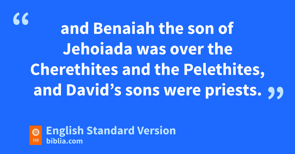 15 So David reigned over all Israel. And David administered justice and equity to all his people. 16 cJoab the son of Zeruiah was over the army, and dJehoshaphat the son of Ahilud was recorder, 17 and eZadok the son of Ahitub and Ahimelech the son of Abiathar were priests, and fSeraiah was secretary, 18 and gBenaiah the son of Jehoiada was over1 the hCherethites and the Pelethites, and David’s sons were priests.