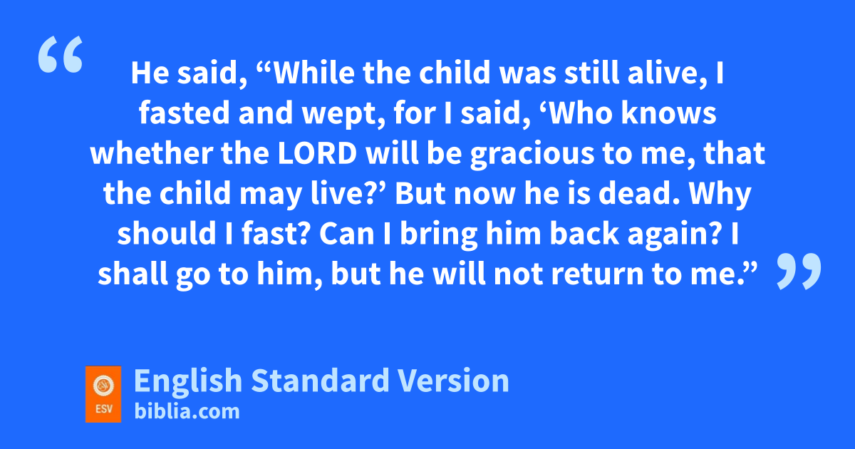 And the Lord afflicted the child that Uriah’s wife bore to David, and he became sick. 16 David therefore sought God on behalf of the child. And David lfasted and went in mand lay all night on the ground. 17 And the elders of his house stood beside him, to raise him from the ground, but he would not, nor did he eat food with them. 18 On the seventh day the child died. And the servants of David were afraid to tell him that the child was dead, for they said, “Behold, while the child was yet alive, we spoke to him, and he did not listen to us. How then can we say to him the child is dead? He may do himself some harm.” 19 But when David saw that his servants were whispering together, David understood that the child was dead. And David said to his servants, “Is the child dead?” They said, “He is dead.” 20 Then David arose from the earth nand washed and anointed himself and changed his clothes. And he went into the house of the Lord oand worshiped. He then went to his own house. And when he asked, they set food before him, and he ate. 21 Then his servants said to him, “What is this thing that you have done? You fasted and wept for the child while he was alive; but when the child died, you arose and ate food.” 22 He said, “While the child was still alive, I fasted and wept, for I said, p‘Who knows whether the Lord will be gracious to me, that the child may live?’ 23 But now he is dead. Why should I fast? Can I bring him back again? I shall go to him, qbut he will not return to me.”