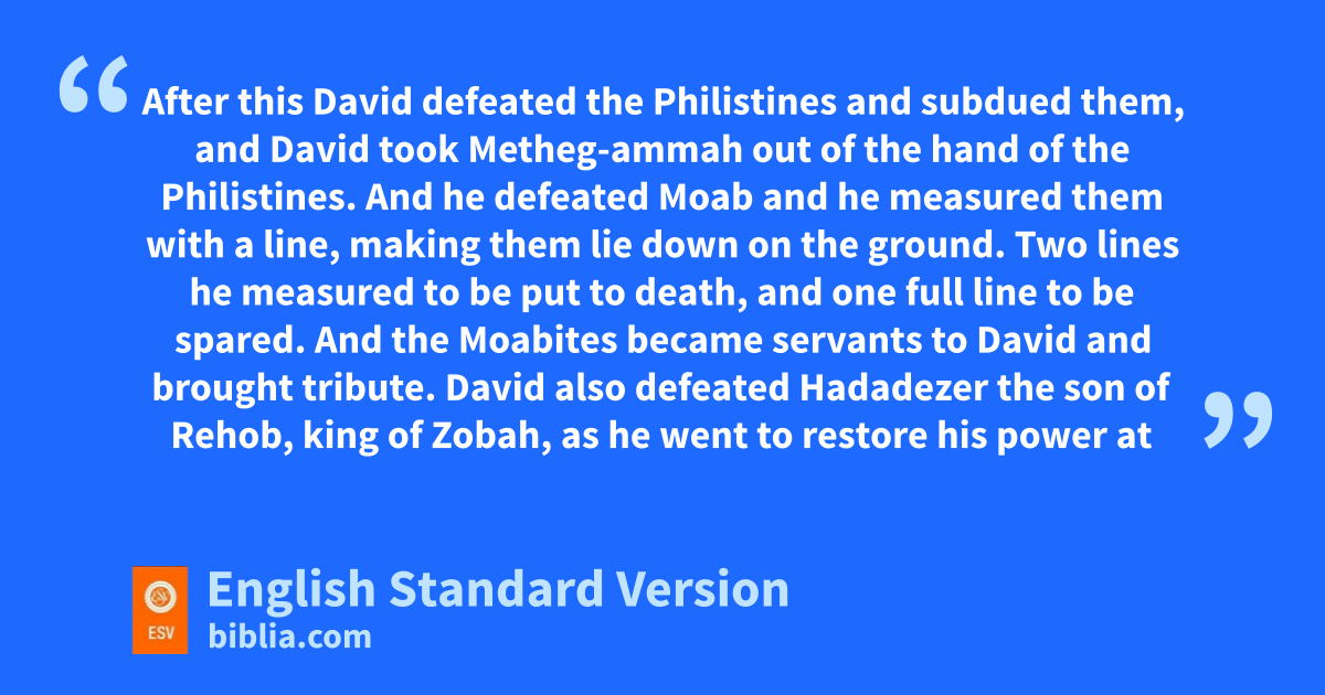 3 David also defeated lHadadezer the son of Rehob, king of mZobah, as he went to restore his power at the river Euphrates. 4 nAnd David took from him 1,700 horsemen, and 20,000 foot soldiers. And David ohamstrung all the chariot horses but left enough for 100 chariots. 5 pAnd when the qSyrians of Damascus came to help lHadadezer king of mZobah, David struck down 22,000 men of the Syrians. 6 Then David put garrisons in Aram of Damascus, and the Syrians rbecame servants to David and brought tribute. sAnd the Lord gave victory to David wherever he went. 7 And David took tthe shields of gold that were carried by the servants of Hadadezer and brought them to Jerusalem. 8 And from Betah and from Berothai, cities of Hadadezer, King David took very much bronze.