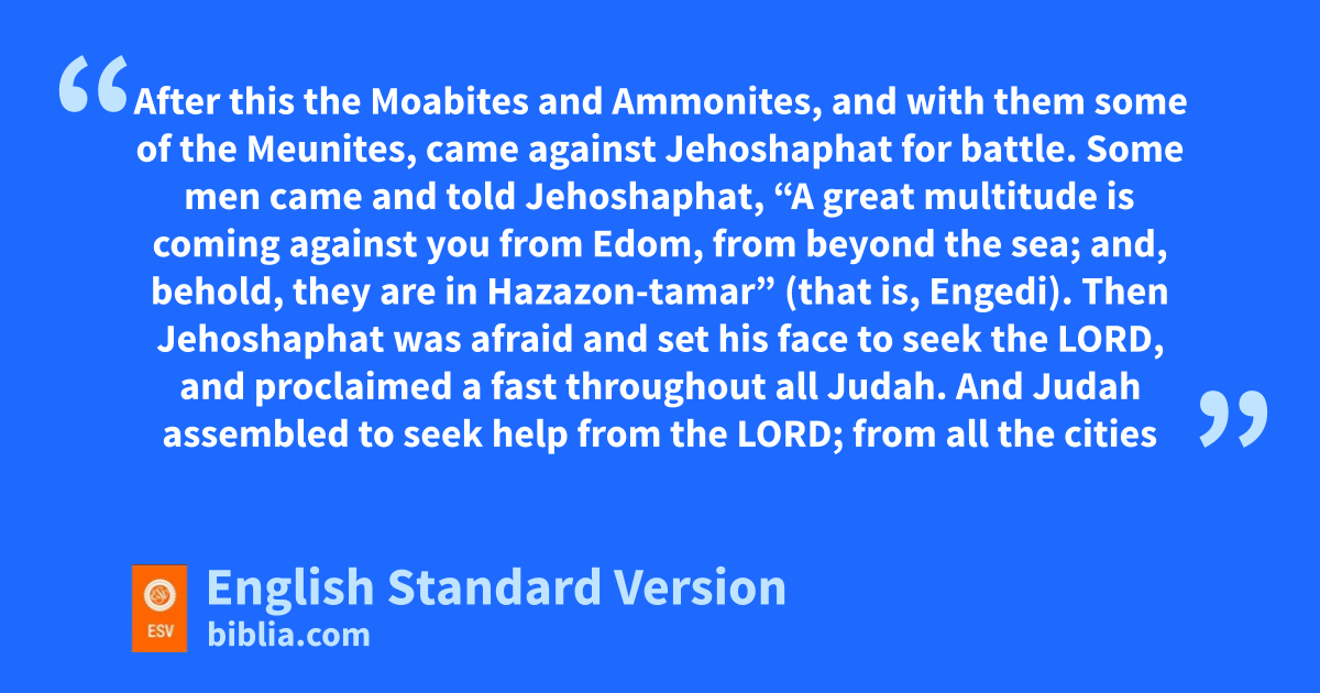 20 After this ithe Moabites and Ammonites, and with them some of the Meunites,1 came against Jehoshaphat for battle. 2 Some men came and told Jehoshaphat, “A great multitude is coming against you from Edom,2 from beyond the sea; and, behold, they are in jHazazon-tamar” (that is, kEngedi). 3 Then Jehoshaphat was afraid and set his face lto seek the Lord, and mproclaimed a fast throughout all Judah. 4 And Judah assembled to seek help from the Lord; from all the cities of Judah they came to seek the Lord.