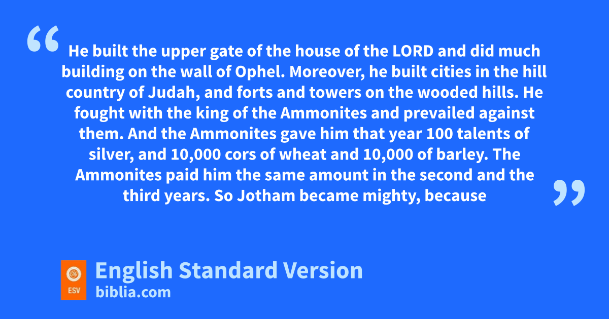 27 aJotham was twenty-five years old when he began to reign, and he reigned sixteen years in Jerusalem. His mother’s name was Jerushah the daughter of Zadok. 2 And he did what was right in the eyes of the Lord according to all that his father Uzziah had done, bexcept he did not enter the temple of the Lord. But the people still followed corrupt practices. 3 He built the upper gate of the house of the Lord and did much building on the wall of cOphel. 4 Moreover, he built cities in the hill country of Judah, and forts and towers on the wooded hills. 5 He fought with the king of the Ammonites and prevailed against them. And the Ammonites gave him that year 100 talents1 of silver, and 10,000 cors2 of wheat and 10,000 of barley. The Ammonites paid him the same amount in the second and the third years. 6 So Jotham became mighty, because he ordered his ways before the Lord his God. 7 dNow the rest of the acts of Jotham, and all his wars and his ways, behold, they are written in the Book of the Kings of Israel and Judah. 8 He was etwenty-five years old when he began to reign, and he reigned sixteen years in Jerusalem. 9 And Jotham slept with his fathers, and they buried him in the city of David, and Ahaz his son reigned in his place.