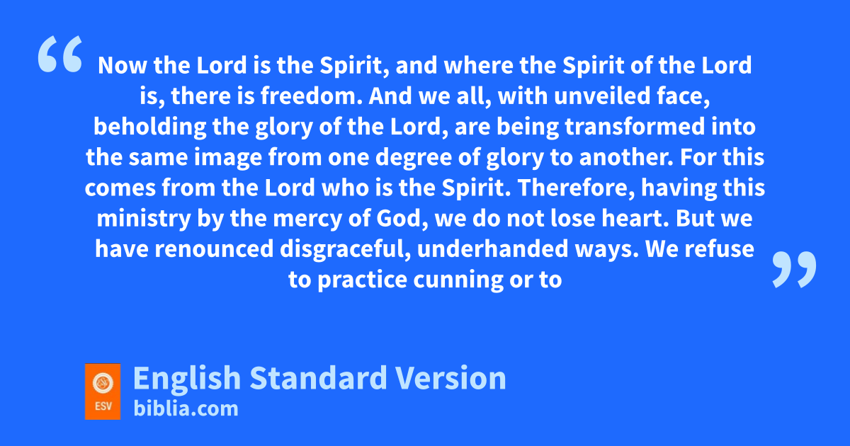 12 Since we have such a hope, jwe are very bold, 13 not like Moses, kwho would put a veil over his face so that the Israelites might not gaze at the outcome of what was being brought to an end. 14 But ltheir minds were mhardened. For to this day, nwhen they read othe old covenant, that same veil remains unlifted, because only through Christ is it taken away. 15 Yes, to this day whenever Moses is read a veil lies over their hearts. 16 But when pone3 turns to the Lord, qthe veil is removed. 17 Now the Lord4 is the Spirit, and where rthe Spirit of the Lord is, there is sfreedom. 18 And we all, with unveiled face, tbeholding uthe glory of the Lord,5 vare being transformed into the same image wfrom one degree of glory to another.6 For this comes from the Lord who is the Spirit.
