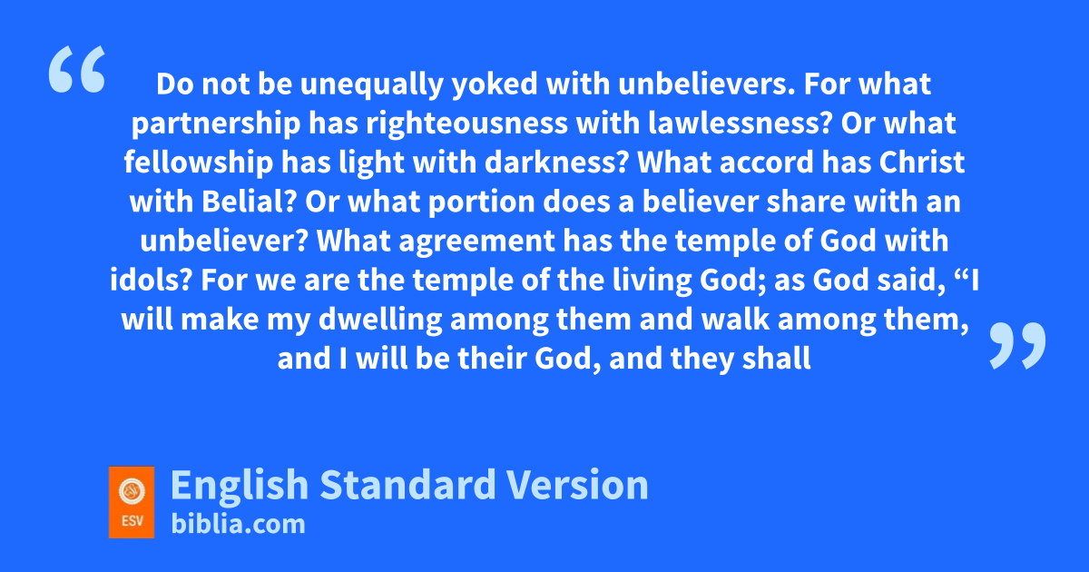 14 zDo not be unequally yoked with unbelievers. For awhat partnership has righteousness with lawlessness? Or bwhat fellowship has light with darkness? 15 cWhat accord has Christ with Belial?2 Or what portion does a believer share with an unbeliever? 16 What agreement has the temple of God with idols? For dwe are the temple of the living God; as God said,