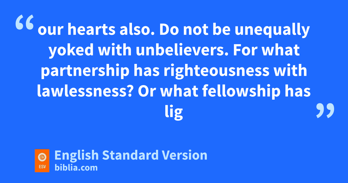 14 zDo not be unequally yoked with unbelievers. For awhat partnership has righteousness with lawlessness? Or bwhat fellowship has light with darkness? 15 cWhat accord has Christ with Belial?2 Or what portion does a believer share with an unbeliever? 16 What agreement has the temple of God with idols? For dwe are the temple of the living God; as God said,