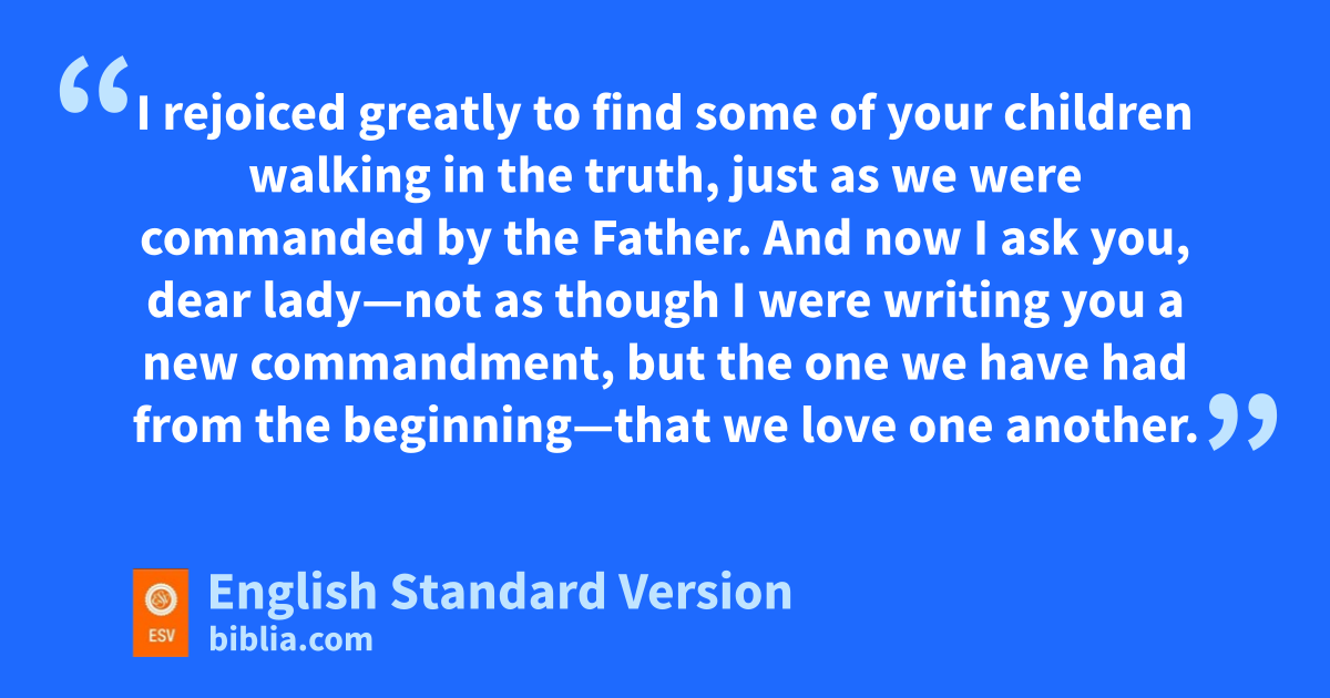 4 gI rejoiced greatly to find some of your children walking in the truth, just as we were commanded by the Father. 5 And now I ask you, dear lady—hnot as though I were writing you a new commandment, but the one we have had from the beginning—ithat we love one another. 6 And jthis is love, that we walk according to his commandments; this is the commandment, just kas you have heard from the beginning, so that you should walk in it. 7 For lmany deceivers mhave gone out into the world, nthose who do not confess the coming of Jesus Christ in the flesh. Such a one is the deceiver and the antichrist. 8 Watch yourselves, oso that you may not lose what we1 have worked for, but pmay win a full reward. 9 Everyone who goes on ahead and does not abide in the teaching of Christ, qdoes not have God. Whoever abides in the teaching qhas both the Father and the Son. 10 If anyone comes to you and does not bring this teaching, rdo not receive him into your house or give him any greeting, 11 for whoever greets him stakes part in his wicked works.