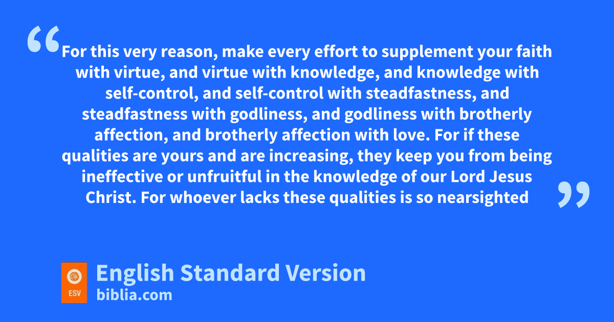 3 His divine power has granted to us all things that pertain to life and godliness, through the knowledge of him fwho called us to3 his own glory and excellence,4 4 by which he has granted to us his precious and very great promises, so that through them you may become gpartakers of the divine nature, hhaving escaped from the corruption that is in the world because of sinful desire. 5 For this very reason, make every effort to supplement your faith iwith virtue,5 and virtue jwith knowledge, 6 and knowledge with self-control, and self-control kwith steadfastness, and steadfastness with godliness, 7 and godliness lwith brotherly affection, and brotherly affection mwith love. 8 For if these qualities6 are yours and are increasing, they keep you from being ineffective or nunfruitful in the knowledge of our Lord Jesus Christ. 9 For whoever lacks these qualities is so nearsighted that he ois blind, having forgotten that he was pcleansed from his former sins. 10 Therefore, brothers,7 be all the more diligent to confirm your calling and qelection, for if you practice these qualities ryou will never fall. 11 For in this way there will be richly provided for you san entrance into the eternal kingdom of our Lord and Savior Jesus Christ.