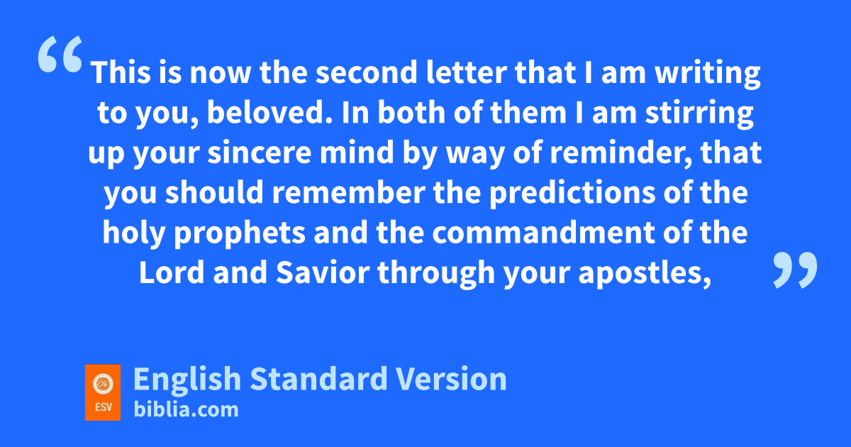 3 This is now the second letter that I am writing to you, beloved. In both of them gI am stirring up your sincere mind by way of reminder, 2 hthat you should remember the predictions of ithe holy prophets and the commandment of the Lord and Savior through your apostles, 3 knowing this first of all, that scoffers will come jin the last days with scoffing, kfollowing their own sinful desires. 4 lThey will say, “Where is the promise of mhis coming? For ever since the fathers fell asleep, all things are continuing as they were from the beginning of creation.” 5 For they deliberately overlook this fact, that the heavens existed long ago, and the earth nwas formed out of water and through water oby the word of God, 6 and that by means of these the world that then existed pwas deluged with water and qperished. 7 But by the same word rthe heavens and earth that now exist are stored up for fire, being kept until the day of judgment and sdestruction of the ungodly.
