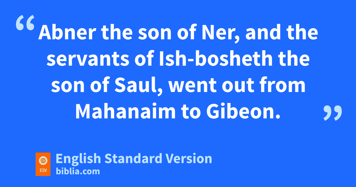 12 Abner the son of Ner, and the servants of Ish-bosheth the son of Saul, went out from Mahanaim to Gibeon. 13 And Joab the son of Zeruiah and the servants of David went out and met them at othe pool of Gibeon. And they sat down, the one on the one side of the pool, and the other on the other side of the pool. 14 And Abner said to Joab, “Let the young men arise and compete before us.” And Joab said, “Let them arise.” 15 Then they arose and passed over by number, twelve for Benjamin and Ish-bosheth the son of Saul, and twelve of the servants of David. 16 And each caught his opponent by the head and thrust his sword in his opponent’s side, so they fell down together. Therefore that place was called Helkath-hazzurim,1 which is at Gibeon. 17 And the battle was very fierce that day. And Abner and the men of Israel were beaten before the servants of David.