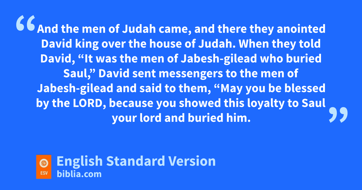 When they told David, j“It was the men of Jabesh-gilead who buried Saul,” 5 David sent messengers to the men of Jabesh-gilead and said to them, k“May you be blessed by the Lord, because you showed this loyalty to Saul your lord and buried him. 6 Now may the Lord show steadfast love and faithfulness to you. And I will do good to you because you have done this thing. 7 Now therefore let your hands be strong, and be valiant, for Saul your lord is dead, and ithe house of Judah has anointed me king over them.”