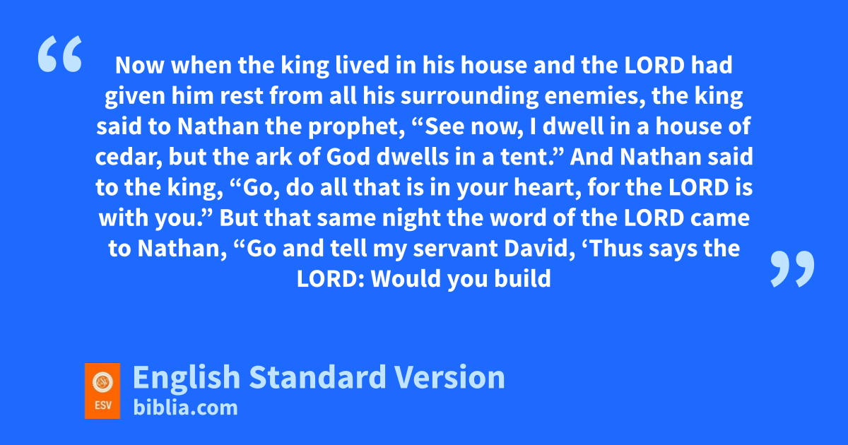7 sNow when the king lived in his house and the Lord thad given him rest from all his surrounding enemies, 2 the king said to uNathan the prophet, “See now, I dwell vin a house of cedar, but the ark of God dwells win a tent.” 3 And Nathan said to the king, x“Go, do all that is in your heart, for the Lord is with you.”