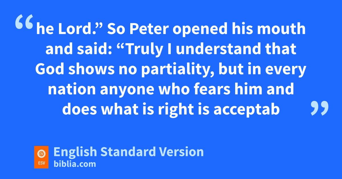 34 So Peter opened his mouth and said: “Truly I understand that fGod gshows no partiality, 35 but fin every nation anyone who fears him and hdoes what is right is acceptable to him. 36 As for ithe word that he sent to Israel, jpreaching good news of kpeace through Jesus Christ (lhe is Lord of all), 37 you yourselves know what happened throughout all Judea, mbeginning nfrom Galilee after the baptism that John proclaimed: 38 how oGod anointed Jesus of Nazareth pwith the Holy Spirit and with qpower. He went about doing good and healing all rwho were oppressed by the devil, sfor God was with him. 39 And twe are witnesses of all that he did both in the country of the Jews and in Jerusalem. uThey put him to death by hanging him on a tree, 40 but vGod raised him on wthe third day and made him to xappear, 41 ynot to all the people but to us who had been chosen by God as zwitnesses, who ate and drank with him after he rose from the dead. 42 And ahe commanded us to preach to the people and to testify bthat he is the one appointed by God to be judge cof the living and the dead. 43 dTo him eall the prophets bear witness that feveryone who believes in him receives gforgiveness of sins hthrough his name.”