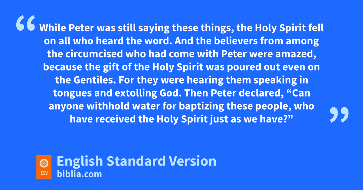 44 While Peter was still saying these things, ithe Holy Spirit fell on all who heard the word. 45 And the believers from among jthe circumcised who had come with Peter were amazed, because kthe gift of the Holy Spirit lwas poured out even on the Gentiles. 46 For they were hearing them mspeaking in tongues and extolling God. Then Peter declared, 47 n“Can anyone withhold water for baptizing these people, who have received the Holy Spirit ojust as we have?” 48 And he pcommanded them qto be baptized in the name of Jesus Christ. Then they asked him to remain for some days.
