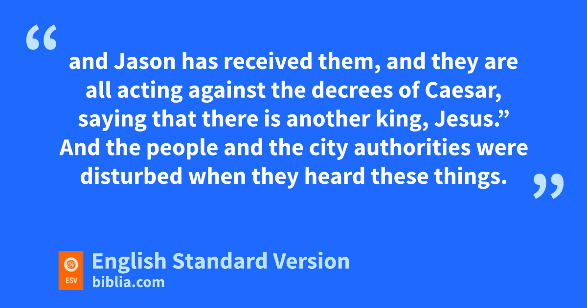 17 Now when they had passed through Amphipolis and Apollonia, they came to gThessalonica, where there was a synagogue of the Jews. 2 And Paul went in, has was his custom, and on three Sabbath days he reasoned with them ifrom the Scriptures, 3 jexplaining and proving that it was necessary for kthe Christ to suffer and lto rise from the dead, and saying, “This Jesus, whom I proclaim to you, is the Christ.” 4 And msome of them were persuaded and joined Paul and Silas, as did na great many of the devout oGreeks and not a few of the leading women. 5 pBut the Jews1 qwere jealous, and taking rsome wicked men of the rabble, they formed a mob, set the city in an uproar, and attacked the house of Jason, seeking to bring them out to the crowd. 6 And when they could not find them, sthey dragged Jason and some of the brothers before the city authorities, shouting, “These men who have turned the world upside down have come here also, 7 and Jason has received them, and they are all acting against tthe decrees of Caesar, saying that there is uanother king, Jesus.” 8 And the people and the city authorities were disturbed when they heard these things. 9 And when they had taken money as security from Jason and the rest, they let them go.