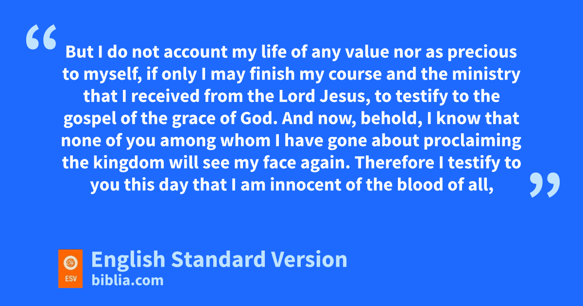 j“You yourselves know khow I lived among you the whole time jfrom the first day that I set foot in Asia, 19 lserving the Lord mwith all humility and with ntears and with trials that happened to me through othe plots of the Jews; 20 how I pdid not shrink from declaring to you anything that was profitable, and qteaching you in public and from house to house, 21 rtestifying both to Jews and to Greeks of srepentance toward God and of tfaith in our Lord Jesus Christ.3 22 And now, behold, I am going to Jerusalem, constrained uby4 the Spirit, not knowing what will happen to me there, 23 except that vthe Holy Spirit testifies to me in every city that wimprisonment and xafflictions await me. 24 But yI do not account my life of any value nor as precious to myself, if only zI may finish my course and athe ministry bthat I received from the Lord Jesus, cto testify to dthe gospel of ethe grace of God. 25 And now, behold, fI know that none of you among whom I have gone about gproclaiming the kingdom will see my face again. 26 Therefore hI testify to you this day that iI am innocent of the blood of all, 27 for jI did not shrink from declaring to you kthe whole counsel of God. 28 lPay careful attention to yourselves and to all mthe flock, in which nthe Holy Spirit has made you ooverseers, pto care for qthe church of God,5 which he robtained swith his own blood.6 29 I rknow that after my departure tfierce wolves will come in among you, unot sparing the flock; 30 and vfrom among your own selves will arise men speaking twisted things, to draw away the disciples after them. 31 Therefore wbe alert, remembering that xfor three years I did not cease night or day yto admonish every one zwith tears. 32 And now aI commend you to God and to bthe word of his grace, which is able to cbuild you up and to give you dthe inheritance among all those who are sanctified. 33 eI coveted no one’s silver or gold or apparel. 34 fYou yourselves know that gthese hands ministered to my necessities and hto those who were with me. 35 In all things iI have shown you that jby working hard in this way we must khelp the weak and lremember the words of the Lord Jesus, how he himself said, ‘It is more blessed mto give than to receive.’ ”