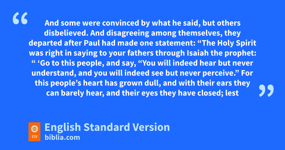 23 When they had appointed a day for him, they came to him at his lodging in greater numbers. From morning till evening ohe expounded to them, testifying to pthe kingdom of God and qtrying to convince them about Jesus rboth from the Law of Moses and from the Prophets. 24 And ssome were convinced by what he said, but others disbelieved. 25 And disagreeing among themselves, they departed after Paul had made one statement: t“The Holy Spirit was right in saying to your fathers through Isaiah the prophet: