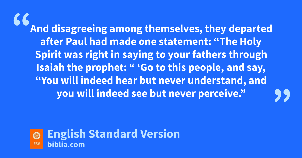 23 When they had appointed a day for him, they came to him at his lodging in greater numbers. From morning till evening ohe expounded to them, testifying to pthe kingdom of God and qtrying to convince them about Jesus rboth from the Law of Moses and from the Prophets. 24 And ssome were convinced by what he said, but others disbelieved. 25 And disagreeing among themselves, they departed after Paul had made one statement: t“The Holy Spirit was right in saying to your fathers through Isaiah the prophet: