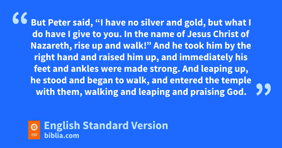 3 Now Peter and John were ogoing up to the temple at pthe hour of prayer, qthe ninth hour.1 2 And a man rlame from birth was being carried, swhom they laid daily at the gate of the temple that is called the Beautiful Gate tto ask alms of those entering the temple. 3 Seeing Peter and John about to go into the temple, he asked to receive alms. 4 And Peter directed his gaze at him, as did John, and said, “Look at us.” 5 And he fixed his attention on them, expecting to receive something from them. 6 But Peter said, u“I have no silver and gold, but what I do have I give to you. vIn the name of Jesus Christ of Nazareth, rise up and walk!” 7 And he took him by the right hand and raised him up, and immediately his feet and ankles were made strong. 8 And wleaping up, he stood and began to walk, and entered the temple with them, walking and leaping and praising God. 9 And xall the people saw him walking and praising God, 10 and recognized him as the one who sat at the Beautiful Gate of the temple, asking for alms. And they were filled with wonder and amazement at what had happened to him.