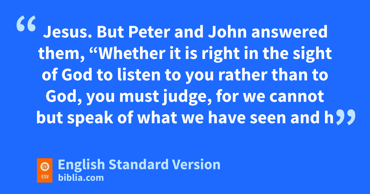 13 eNow when they saw the boldness of Peter and John, and perceived that they were uneducated, common men, they were astonished. And they recognized that they had been with Jesus. 14 But seeing the man who was healed fstanding beside them, gthey had nothing to say in opposition. 15 But when they had commanded them to leave the council, they conferred with one another, 16 saying, h“What shall we do with these men? For that ia notable sign has been performed through them is evident to all the inhabitants of Jerusalem, and we cannot deny it. 17 But in order that it may spread no further among the people, let us warn them jto speak no more to anyone in this name.” 18 So they called them and charged them not to speak or teach at all in the name of Jesus. 19 But Peter and John answered them, k“Whether it is right in the sight of God to listen to you rather than to God, you must judge, 20 for lwe cannot but speak of what mwe have seen and heard.” 21 And when they had further threatened them, they let them go, finding no way to punish them, nbecause of the people, for all were praising God ofor what had happened. 22 For the man on whom this sign of healing was performed was more than forty years old.